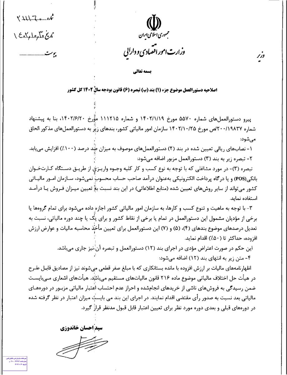 - دستورالعمل شماره ۵۵۷۰ مورخ ۱۴۰۲/۰۱/۱۹.