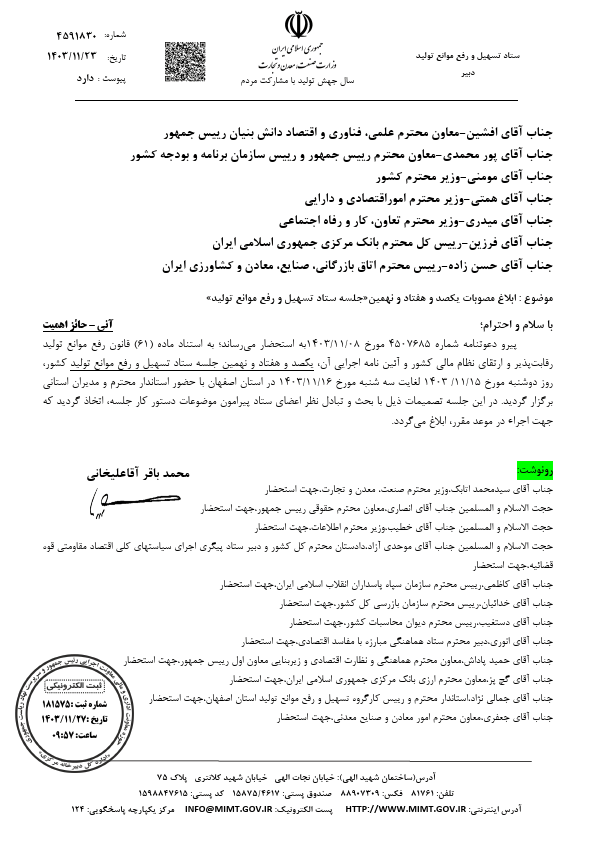 پیرو دعوتنامه شماره 4507685 مورخ 1403/11/08 به استحضار می رساند؛ به استناد ماده (61) قانون رفع موانع تولید رقابت پذیر و ارتقای نظام مالی کشور و آیین نامه اجرایی آن، یکصد و هفتاد و نهمین جلسه ستاد تسهیل و رفع موانع تولید کشور، روز دوشنبه مورخ 1403/11/15 لغایت سه شنبه مورخ 1403/11/16 در استان اصفهان با حضور استاندار محترم و مدیران استانی برگزار گردید. در این جلسه تصمیمات ذیل با بحث و تبادل نظر اعضای ستاد پیرامون موضوعات دستور کار جلسه، اتخاذ گردید که جهت اجرا در موعد مقرر، ابلاغ می گردد.