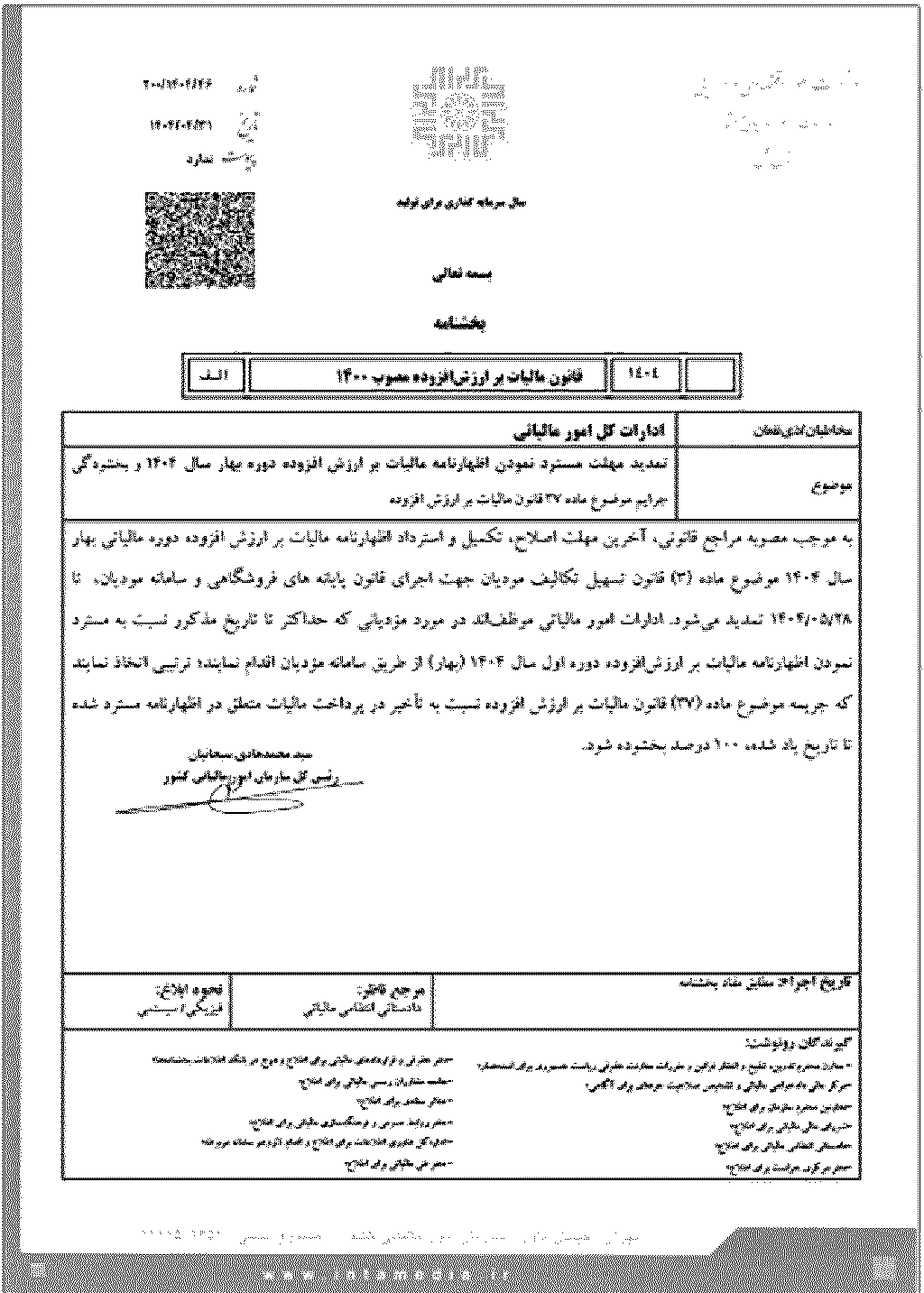 بخشنامه سازمان امور مالیاتی کشور در خصوص تمدید مهلت مسترد نمودن اظهارنامه مالیات بر ارزش افزوده دوره بهار سال 1404 و بخشودگی جرایم ماده 37 قانون مالیات بر ارزش افزوده مصوب 1404,04,31 با اصلاحات و الحا