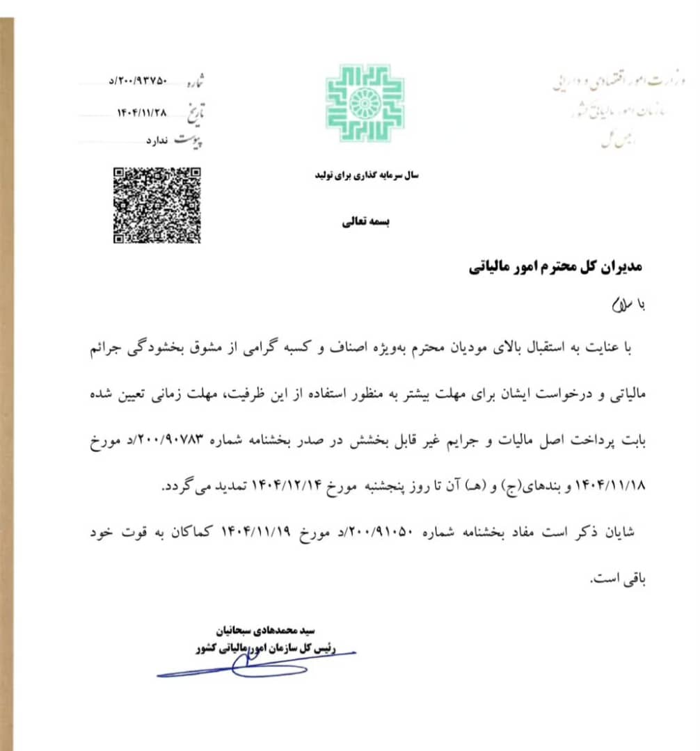 با عنایت به استقبال بالای مودیان محترم بهویژه اصناف و کسبه گرامی از مشوق بخشودگی جرایم مالیاتی و درخواست ایشان برای مهلت بیشتر به منظور استفاده از این ظرفیت، مهلت زمانی تعیینشده بابت پرداخت اصل مالیات و جرایم غیرقابل بخشش در صدور بخشنامه شماره 200/90783/د مورخ 1404/11/18 و بندهای (ج) و (هـ) آن تا روز پنجشنبه مورخ 1404/12/14 تمدید میگردد.