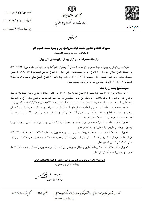 شماره 80/34352 1404/02/31 مصوبات هشتاد و هفتمین نشست هیات مقررات زدایی و بهبود محیط کسب وکار وزارت نفت ـ شرکت ملی پالایش و بخش فرآورده های نفتی ایران هیات مقررات زدایی و بهبود محیط کسب و کار که در ادامه از آن به عنوان «هیات» یاد می شود در جلسه مورخ 1404/02/22، به استناد قانون اصلاح مواد 1 و 7 قانون اجرای سیاست های کلی اصل 44 قانون اساسی (مصوب 1399/11/15)، قانون تسهیل صدور مجوزهای کسب و کار (مصوب 1400/12/24) و بند (پ) ماده 13 قانون تامین مالی تولید و زیرساخت ها (مصوب 1402/12/22)، در خصوص موارد زیر اتخاذ تصمیم نمود: تصویب مجوز جدید وزارت نفت: 1ـ به استناد جز (4ـ 1) بند (ت) تبصره (3) قانون بودجه سال 1404 کل کشور، تعداد 1 عنوان مجوز جدید وزارت نفت به شرح ذیل به همراه کاربرگ راهنمای دریافت این مجوز، متضمن شرایط، مدارک، هزینه و زمان صدور آن، به فهرست مجوزهای وزارت نفت در بند (الف) مصوبات پنجاه و هشتمین نشست هیات به شماره 80/12510 مورخ 1401/01/27 اضافه می شود. 2ـ دبیرخانه هیات مکلف است، پس از انجام هماهنگی های لازم با وزارت نفت، راهنمای دریافت مجوزها را در درگاه ملی مجوزهای کشور بارگذاری نماید و در دسترس عموم قرار دهد (راهنمای دریافت 1 عنوان مجوز مذکور، ممهور به مهر دبیرخانه هیات، جز پیوست لاینفک این مصوبه است). 3ـ وزارت نفت مکلف است، درگاه تخصصی برای صدوراین مجوز را به درگاه ملی مجوزهای کشور متصل و مجوز مزبور را به صورت برخط از طریق درگاه ملی مجوزها، صادر نماید. 4ـ وزارت نفت مکلف است، بند (5 ـ 5) شیوه نامه تامین بنزین ویژه (سوپر) به شماره 707 ـ 20/2 مورخ 1403/10/26، در ارتباط با نحوه قیمت گذاری و دریافت مالیات بر ارزش افزوده را با توجه به جز (4ـ1) بند (ت) تبصره (3) قانون بودجه سال 1404 کل کشور، اصلاح نماید. 5 ـ وزارت نفت مکلف است، شیوه نامه تعلیق و ابطال مجوزهای واردات بنزین ویژه (سوپر) را حداکثر ظرف مدت یک ماه تدوین و به دبیرخانه هیات ارسال نماید. یک عنوان مجوز مربوط به شرکت ملی پالایش و پخش فرآورده های نفتی ایران واردات بنزین ویژه (سوپر) سرپرست امور اقتصادی و دارایی و رییس هیات مقررات زدایی و بهبود محیط کسب و کار ـ سید رحمت ا... اکرمی |