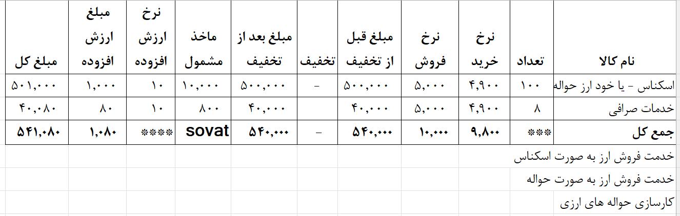 - فروش اسکناس ارز منظور ارزش هر واحد اسکناس خارجی است. ( سازمان به عنوان خدمت لحاظ کرده است. ) در این نوع خدمت فقط مابه التفاوت خرید و فروش مشمول ارزش افزوده میباشد.
