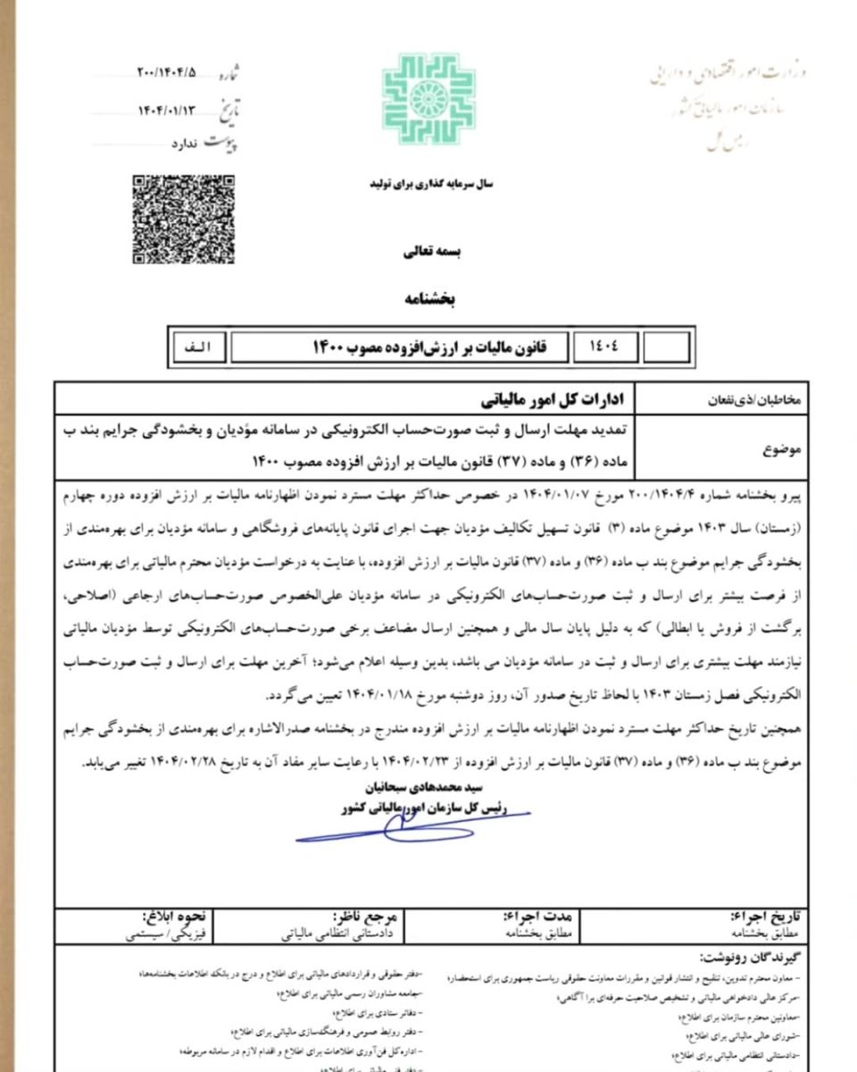 همچنین مهلت استرداد اظهارنامه مالیات بر ارزش افزوده فصل زمستان 1403، از 1404/02/23 به 1404/02/28 تغییر یافت.