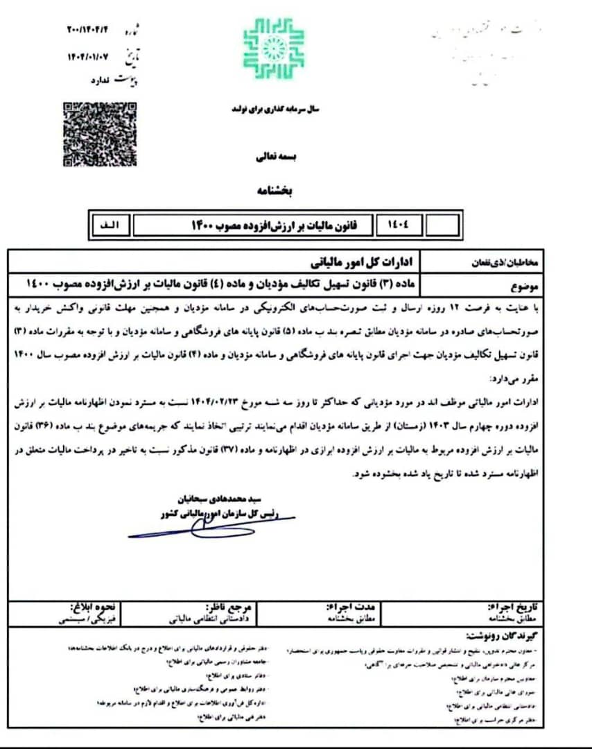 مرجع صادرکننده: رئیس کل سازمان امور مالیاتی کشور – سید محمدهادی سبحانیان